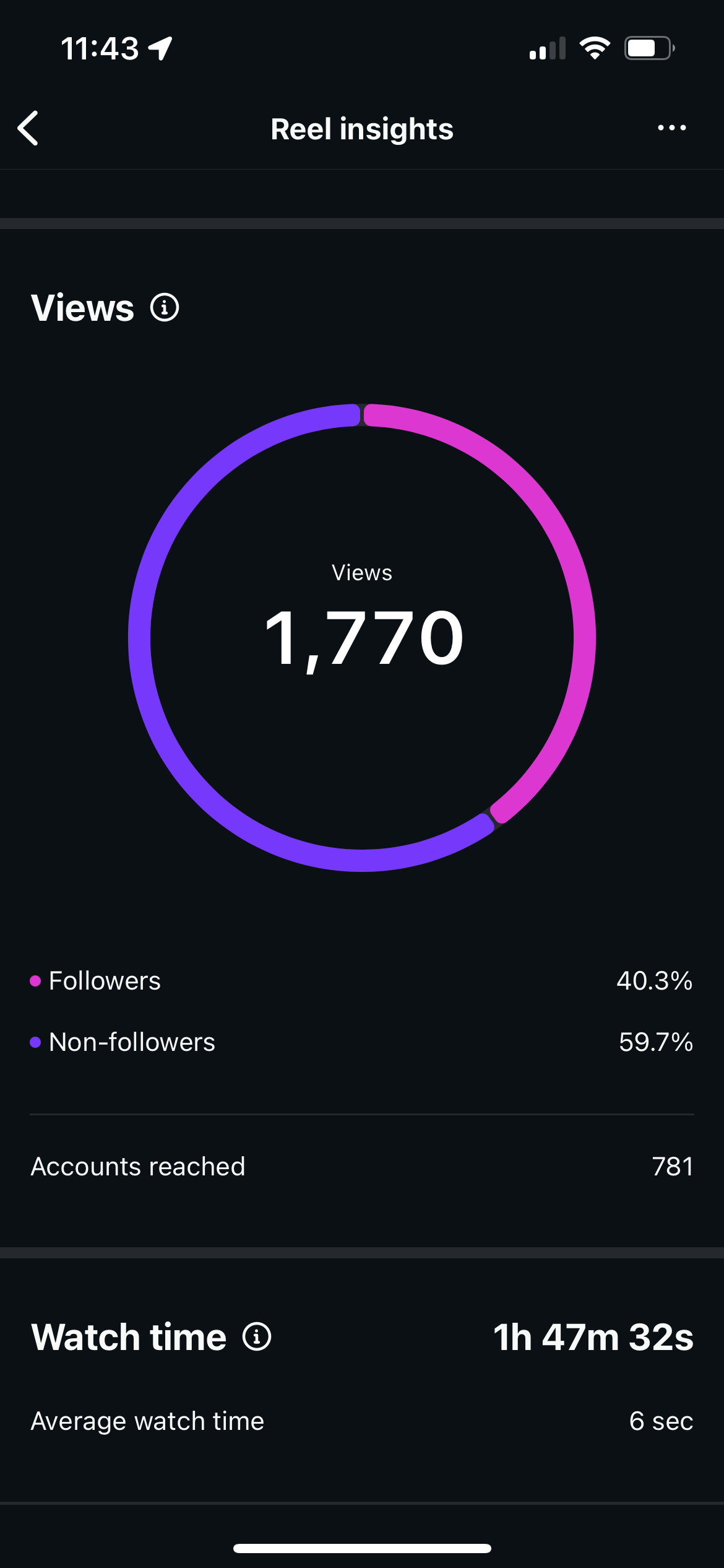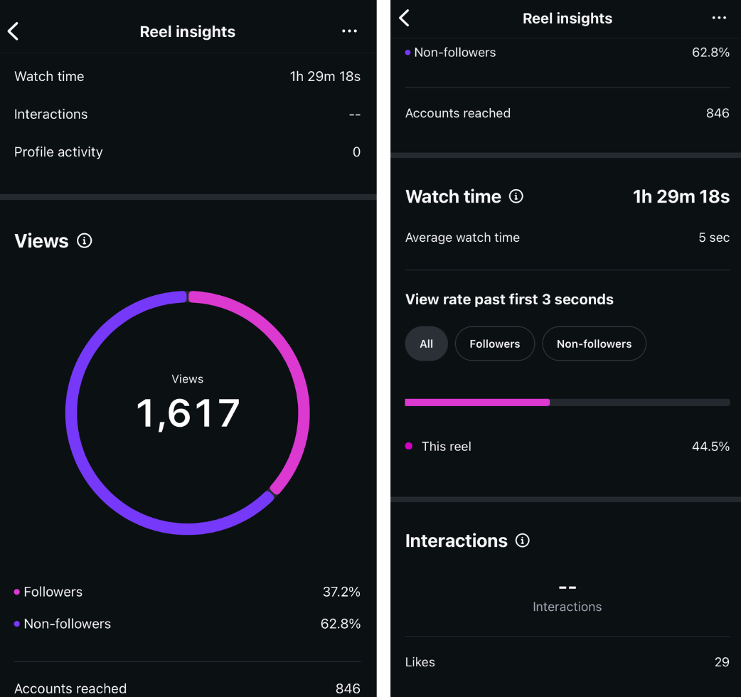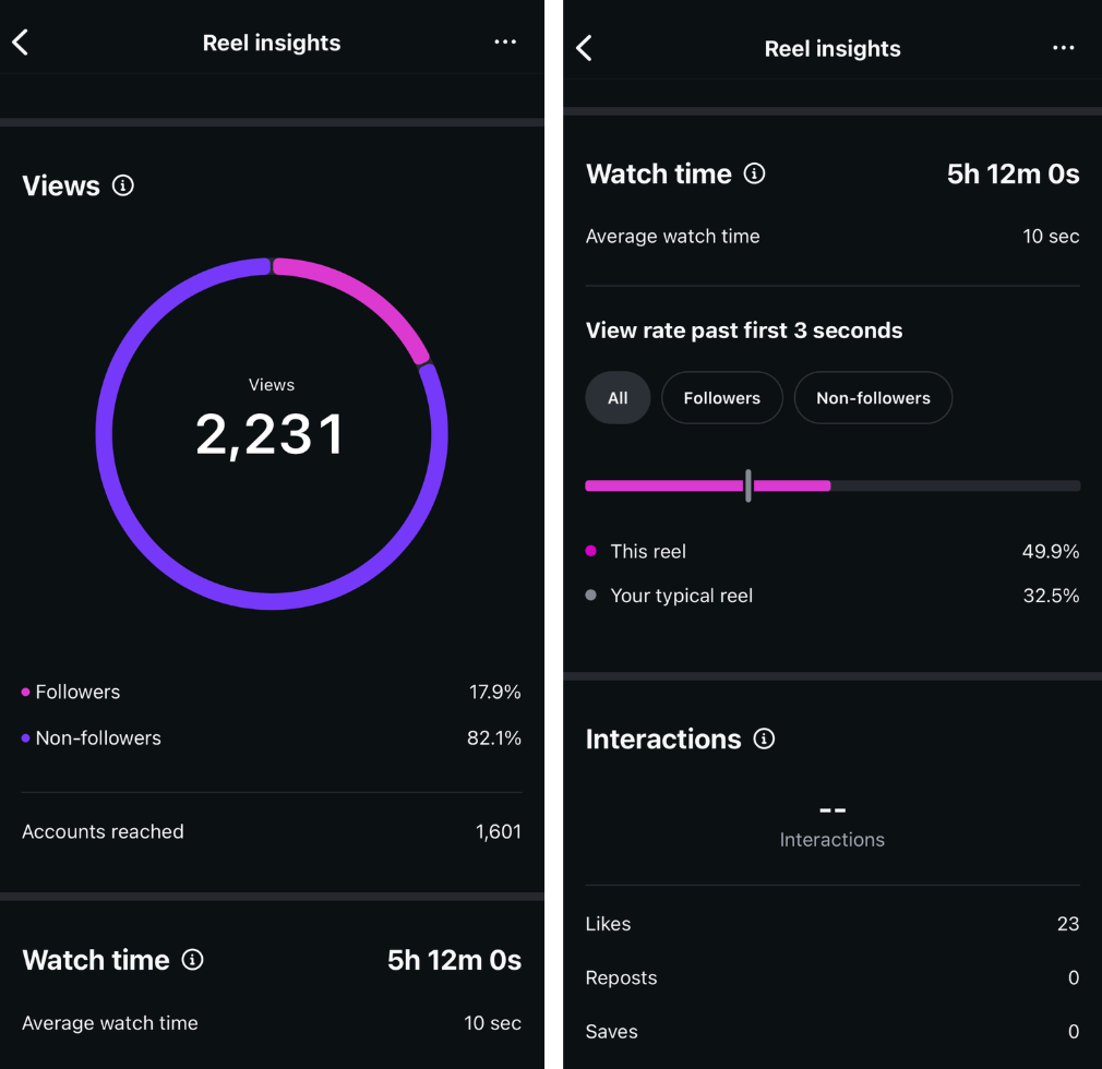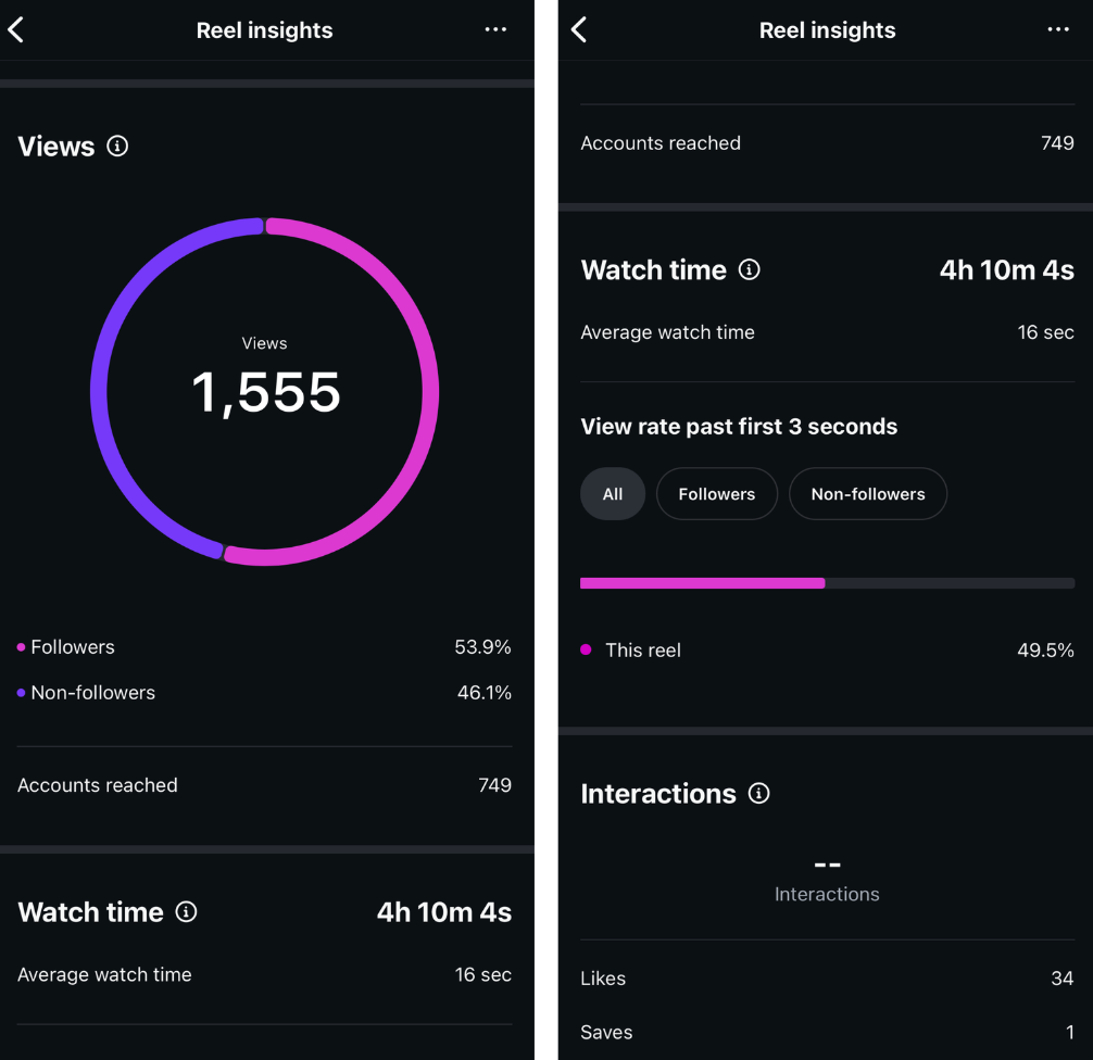 Außerdem sehen wir, dass mehr als 44 % der Zuschauer länger als drei Sekunden dranbleiben. Das zeigt, dass sie grundsätzlich Interesse an den geposteten Inhalten haben.